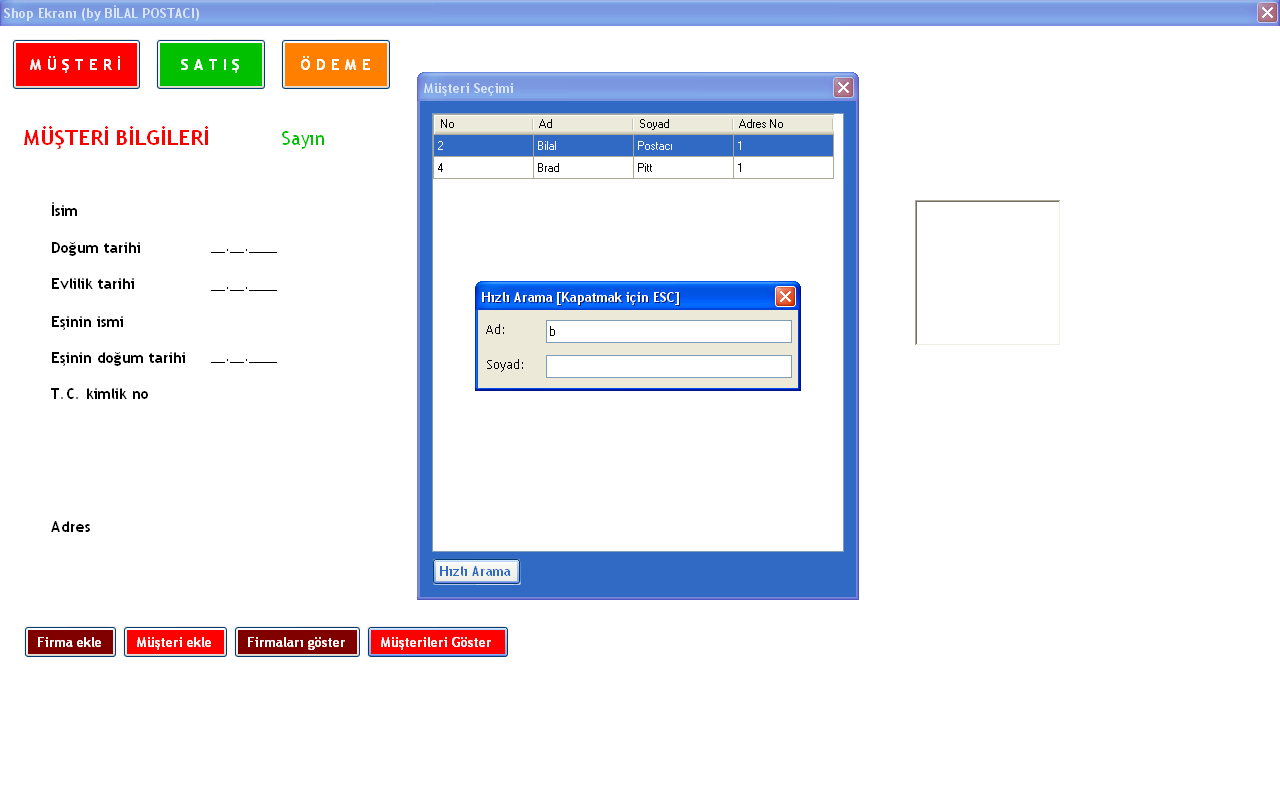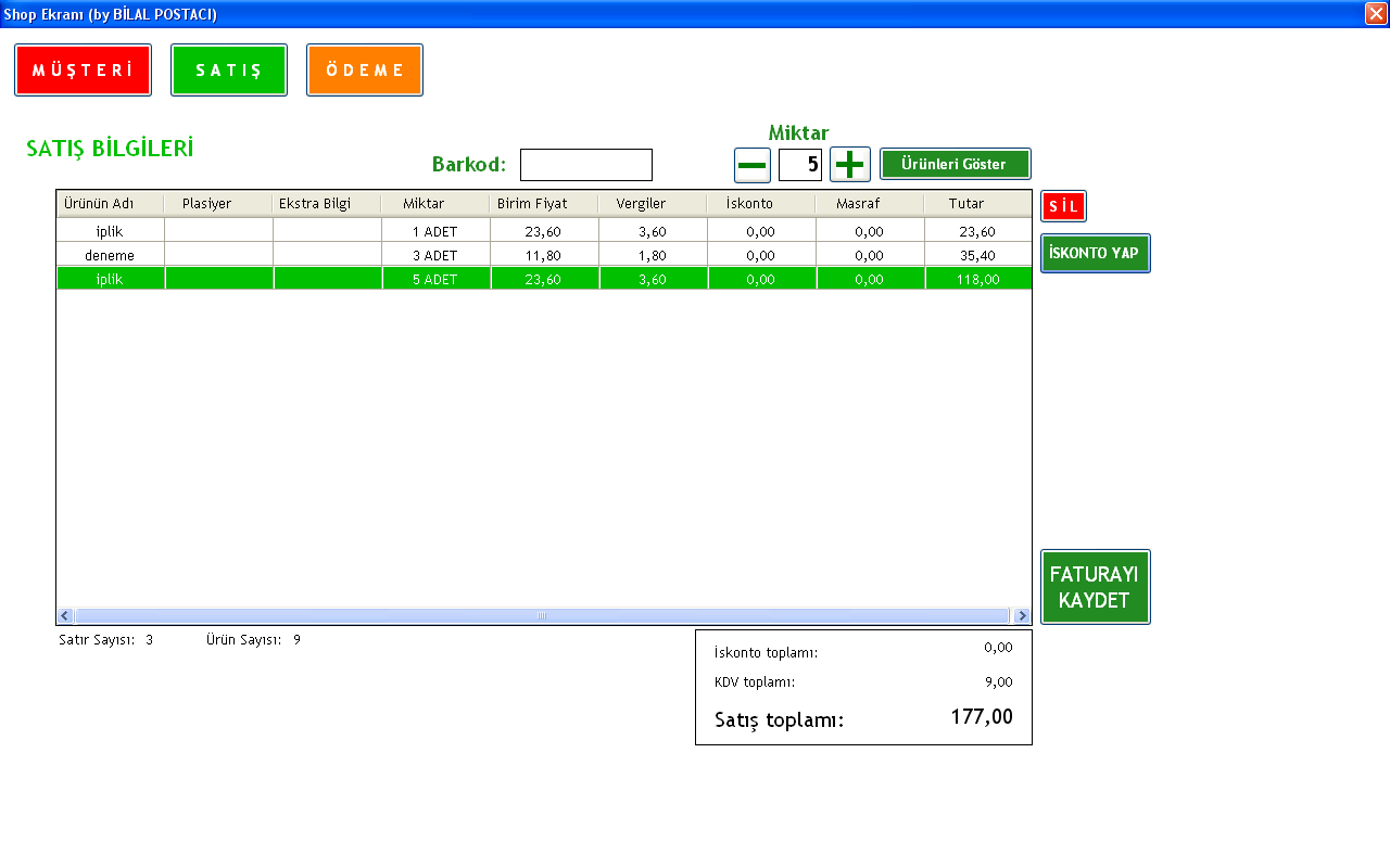 Shop Ekranı, Mikroshop programından feyz alınarak yapılmış, firmaların müşterilerine ürünlerini iskonto yaparak veya yapmayarak sattıkları bir otomasyon programıdır. Program, 3 ekrandan oluşmaktadır. Bunların birincisinde müşteri ve firmalar ile ilgili bilgilere erişebilir, bu bilgileri değiştirebilir veya yeni kayıt girebilirler. İkincisinde satış yapılacak ürünleri tabloya ekleyip istediğiniz ürünlere istediğiniz miktarda iskonto yapabilirsiniz. Son olarak da ödeme ekranında genel toplam üzerinden iskonto yapabilir veya kaydettiğiniz faturayı yazdırabilirsiniz.