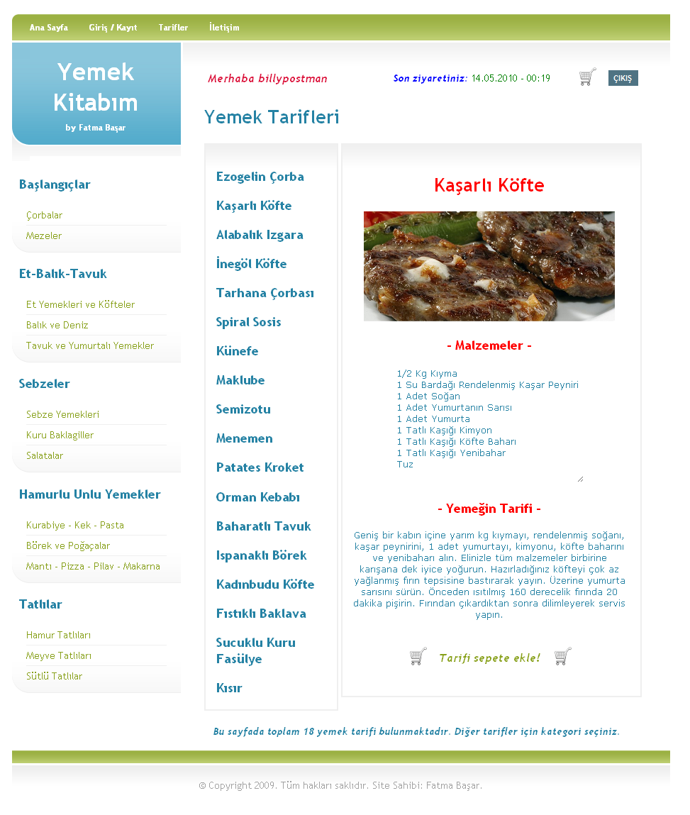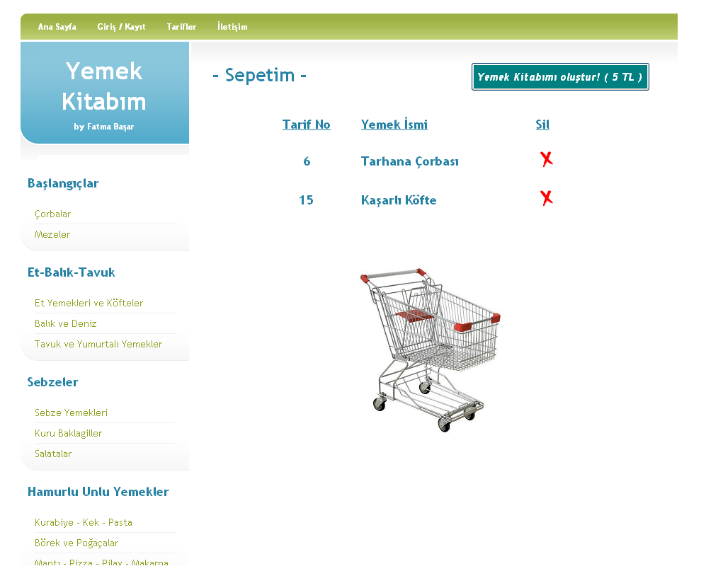 Yemek kitabım, içerisinde yemek tariflerinin bulunduğu ve dileyen kullanıcının siteye üye olarak kendi yemek kitabını oluşturabileceği bir web sitesidir. Kayıtlı kullanıcılar beğendikleri yemek tariflerini sepetlerine ekleyip, istedikleri zaman bunları kitap olarak alabilmektedirler.